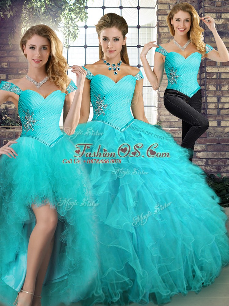 Home >  Quinceanera Dresses >  Detachable Quinceanera Skirts > Elegant Sleeveless Floor Length Beading and Ruffles Lace Up 15 Quinceanera Dress with Aqua Blue