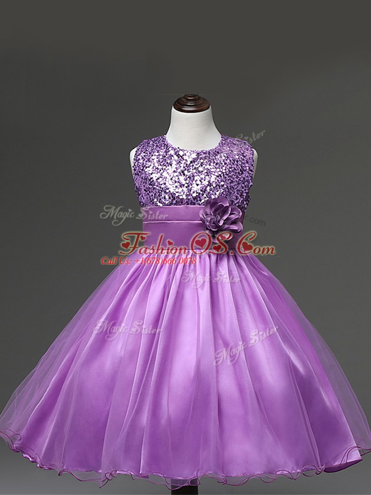 Elegant Sleeveless Tulle Knee Length Zipper Pageant Gowns For Girls in Lilac with Sequins and Hand Made Flower