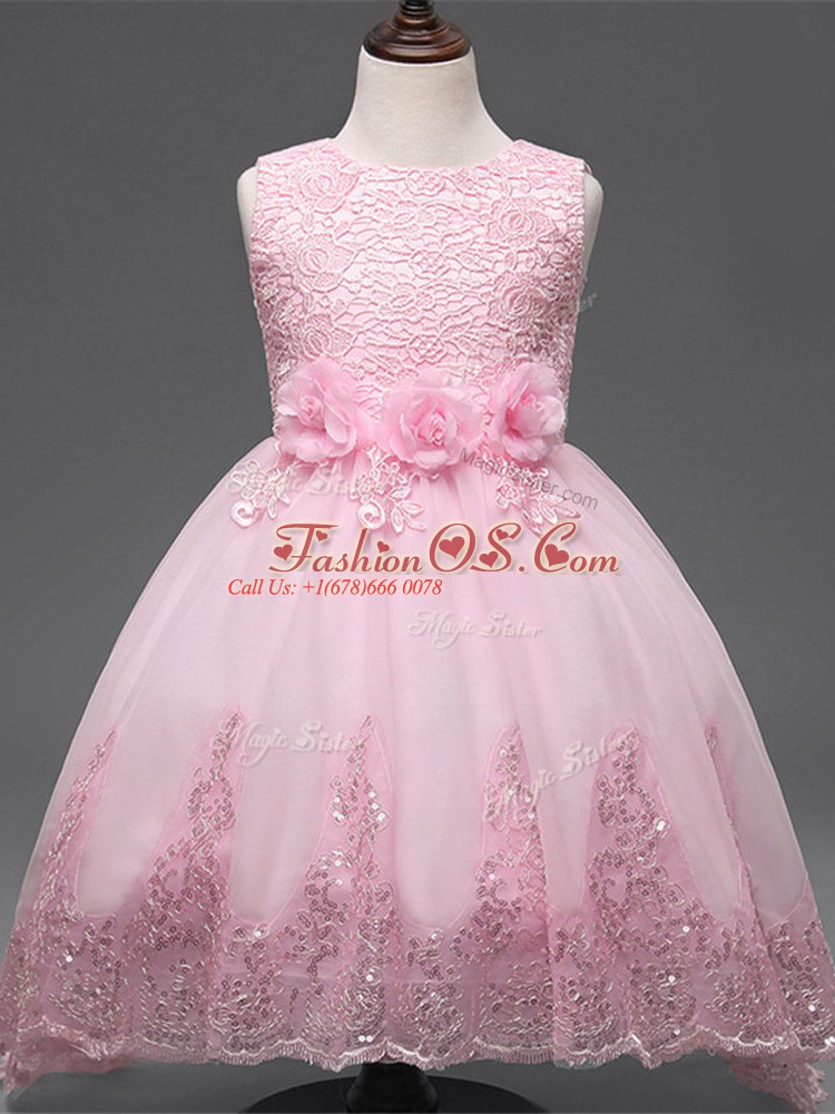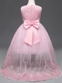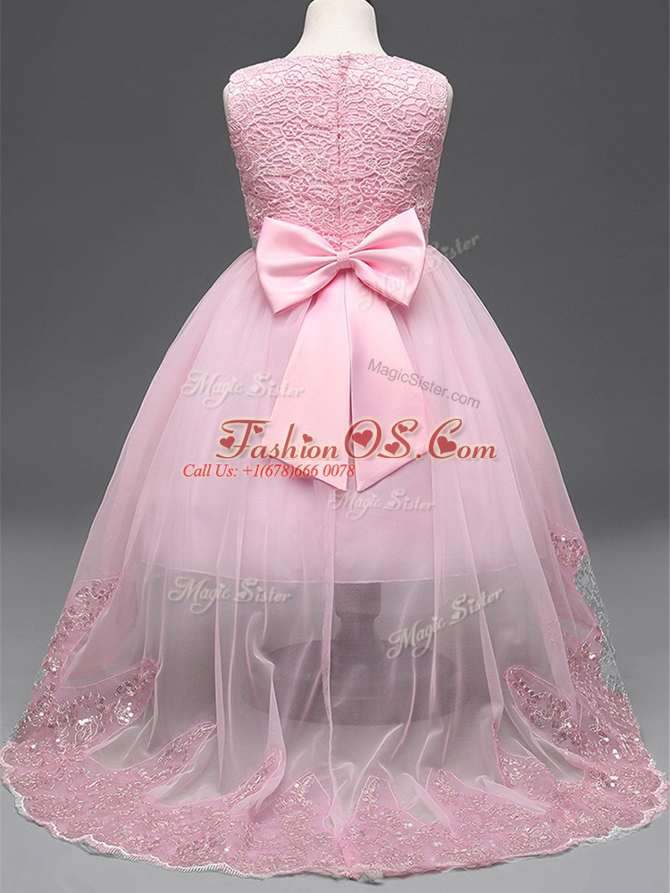 Elegant Sleeveless Zipper High Low Lace and Appliques and Bowknot and Hand Made Flower Pageant Gowns For Girls