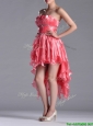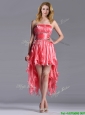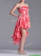 Elegant Strapless High Low Beaded Decorated Waist Prom Dress in Coral Red