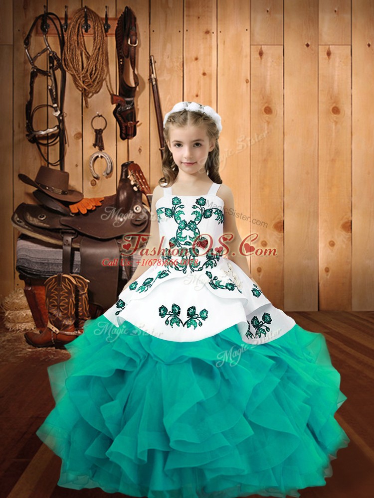 Home >  Special Occasion Dresses >  Beautiful Kids Pageant Dresses > Elegant Straps Sleeveless Pageant Gowns Floor Length Embroidery and Ruffles Aqua Blue Organza