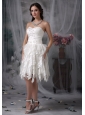 Lace make this dress fabulous. This sweetheart strapless bodice is covered with beads and is accented by a satin waistband to creat the appearance of a curvier waist. Layers of lace create a fun and flirty skirt. Heads turns when you are in this knee-length dress at your wedding.