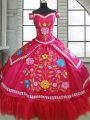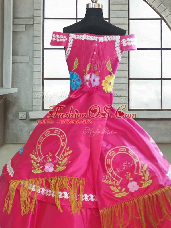 Home >  Quinceanera Dresses >  Quinceanera Dresses 2018 > Elegant Sweetheart Short Sleeves Quinceanera Gowns Floor Length Beading and Embroidery Hot Pink Taffeta