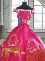 Elegant Sweetheart Short Sleeves Quinceanera Gowns Floor Length Beading and Embroidery Hot Pink Taffeta
