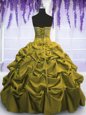 Home >  Quinceanera Dresses >  New Arrival Quinceanera Dresses > Elegant Sweetheart Sleeveless 15th Birthday Dress Floor Length Beading and Appliques and Pick Ups Brown Taffeta