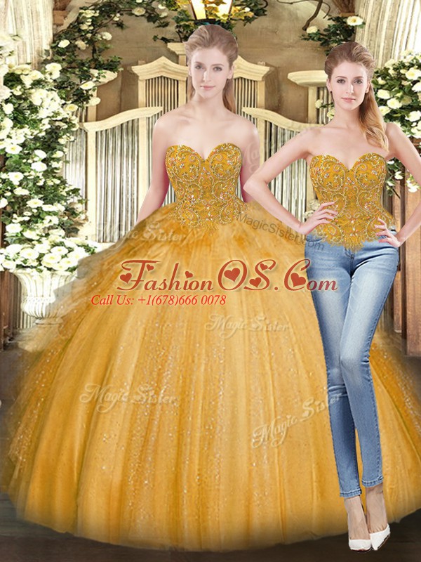 Home >  Quinceanera Dresses >  Detachable Quinceanera Skirts > Elegant Sweetheart Sleeveless 15th Birthday Dress Floor Length Beading and Ruffles Gold Tulle