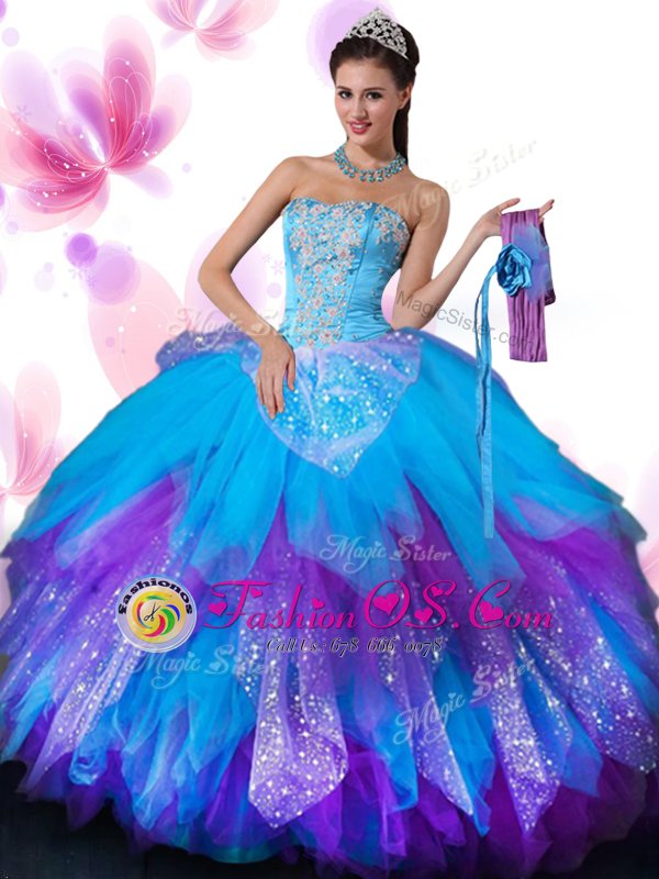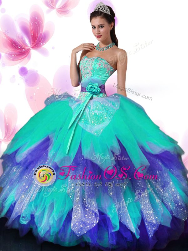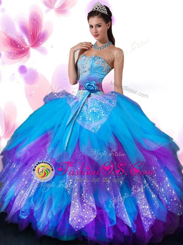 Elegant Tulle Sleeveless Floor Length Quince Ball Gowns and Appliques and Ruffled Layers and Hand Made Flower