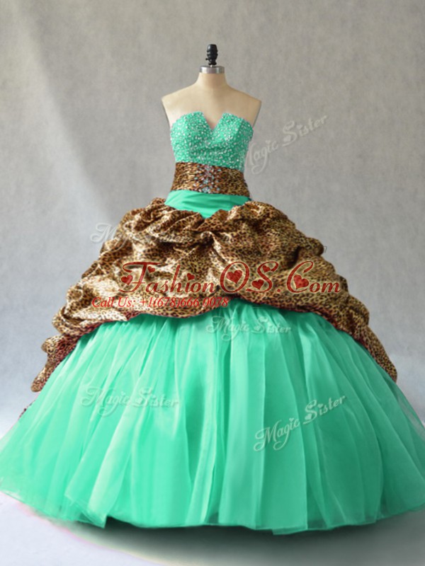 Elegant Turquoise Organza Lace Up V-neck Sleeveless Sweet 16 Dresses Brush Train Beading and Pick Ups