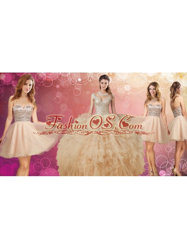 Home >  Quinceanera Dresses >  Quinceaneara Package > Elegant V Neck Ruffled Quinceanera Dress and Fashionable Sequined A Line Dama Dress in Champagne