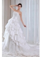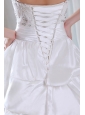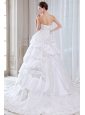 This fabulously fashioned bridal style features delectable designer details. Sparkling appliques accented with over covered the bodice and the bottom part of the skirt. A strapless style achieve a sexy look. Radiant pleats band shape the curves. Wider, pleating wraps the dropped hips, expanding to loose folds that reveal a gathered, full-length underskirt beneath, and bustling in lovely scrunched tiers down the back. A lace up back completes the dress to make the dress easy up and off. A delicate and romantic dress that will conquer countless hearts of women.