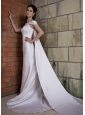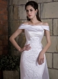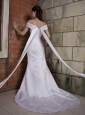 Elengant and noble! The off shoulder with teffeta material white wedding dress is worth you having! The wide straps bring a straigt neckline and two long and wide streamers on the back that flow down to the floor. Large amont of embroidery accent the whole dress,this is the only decoration on the noble dress but in a very large amount. The floor length mermaid style has a champel trail which flows to the back and a hidden zipper.