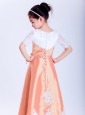 Sweet and lovely, this flower girl dress has class written all over it. Exclusive beaded applique covers around the adorable neckline as well as the half-sleeves. Special design in two contrastion color shows the energy of youth. The ruched waist is slightly gathered by exquisite applique. Hidden zipper back with fastener decoration adds the detail. Her angelic face will be all the judges see in this pretty dress.