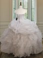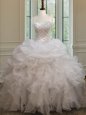 Home >  Quinceanera Dresses >  Perfect Quinceanera Dresses > Elegant White Organza Lace Up Sweet 16 Quinceanera Dress Sleeveless Floor Length Beading and Ruffles and Pick Ups