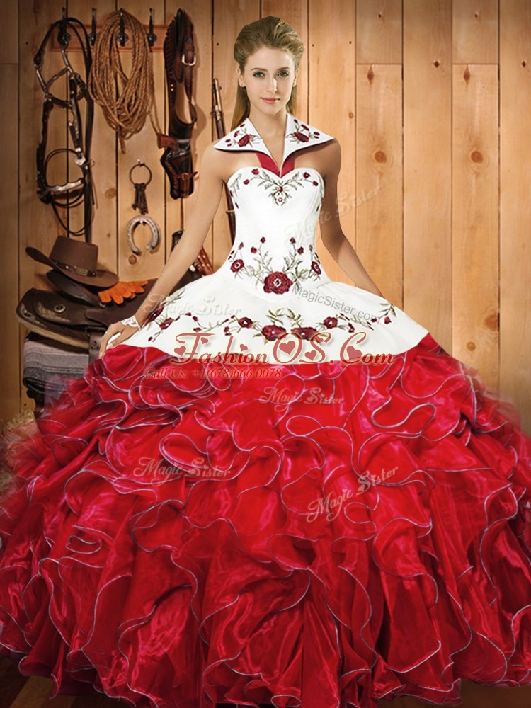Elegant Wine Red Ball Gowns Halter Top Sleeveless Satin and Organza Floor Length Lace Up Embroidery and Ruffles Ball Gown Prom Dress
