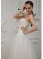 This wonderful white wedding dress must be the number one, the one people are to go after! This one features a body-hugging bodice and a puffy skirt has a floor length overlayed with a sheer net, which makes you Snow White. The neckline is highlighted with feather embellishment and a chapel train on the back that fixes all eyes upon. This dress is so gorgeous, it will even make Cinderella jealous!