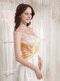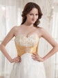 This fabulous A-line style is so classic and elegant. The bodice of the dress features a fashionable sweetheart neckline with clear beading encrusted throughout. A wide ruched ribbon on the middle section accents your waist.The skirt features more of the beautiful embroidery found in the bodice. The back features a corset-style closure that ensures a perfect fit. All eyes are on you!