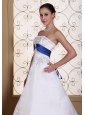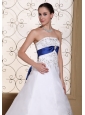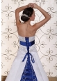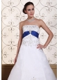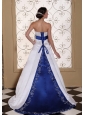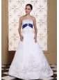 You will be the most beautiful bride in this graceful dress! It is made from a beautiful satin blend that has a gorgeous sheen to it and features a strapless neckline. Beautiful embroidery wraps bodice and trimed the skirt. A blue band with beaded work in empire waist shows your figure. The stunning skirt extends into a sweep train in the back. The different blue color fabric in the back attracts more attention. An absolutely perfect dress when looking your best is a must.
