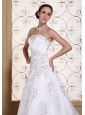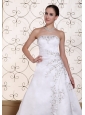 This gorgeous white wedding dress will leave you a last long memory for sure! The strapless, fitted bodice is adorned with exquisite appliques that can conture your natural figure. The floor-length skirt with embroidery makes the dress so beautilful that will attract more attention. A zipper up back completes this wonderful design!