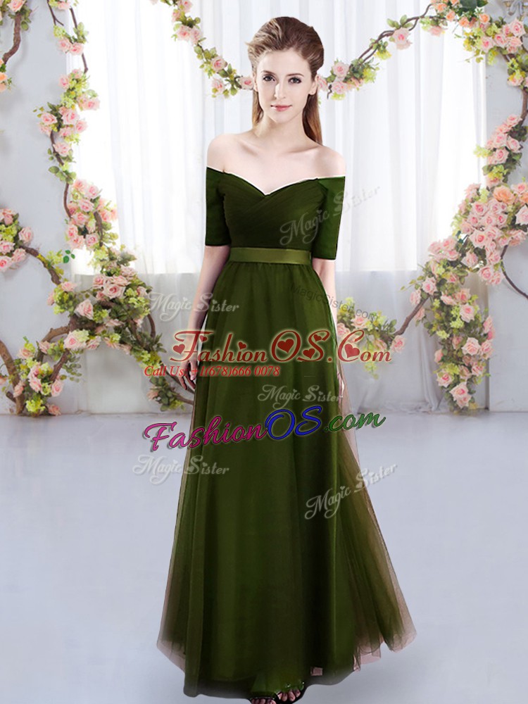 Empire Quinceanera Dama Dress Olive Green Off The Shoulder Tulle Short Sleeves Floor Length Lace Up