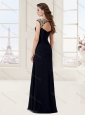 Empire Scoop Applique Black Evening Dress with Cap Sleeves