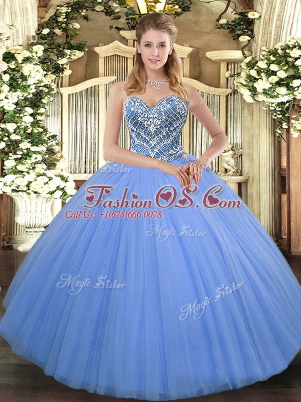 Enchanting Floor Length Lace Up Ball Gown Prom Dress Baby Blue for Military Ball and Sweet 16 and Quinceanera with Beading