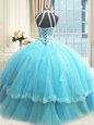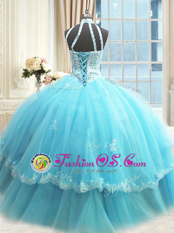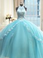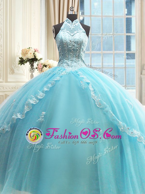 Enchanting Halter Top Aqua Blue Tulle Lace Up Quince Ball Gowns Sleeveless Floor Length Beading and Lace and Appliques