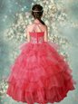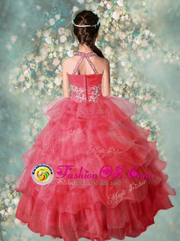Home >  Special Occasion Dresses >  Mini Quinceanera Dresses > Enchanting Halter Top Watermelon Red Ball Gowns Beading and Ruffled Layers Little Girls Pageant Gowns Zipper Organza Sleeveless Floor Length