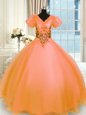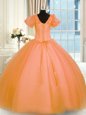 Enchanting Orange V-neck Neckline Appliques Ball Gown Prom Dress Short Sleeves Lace Up
