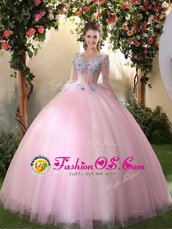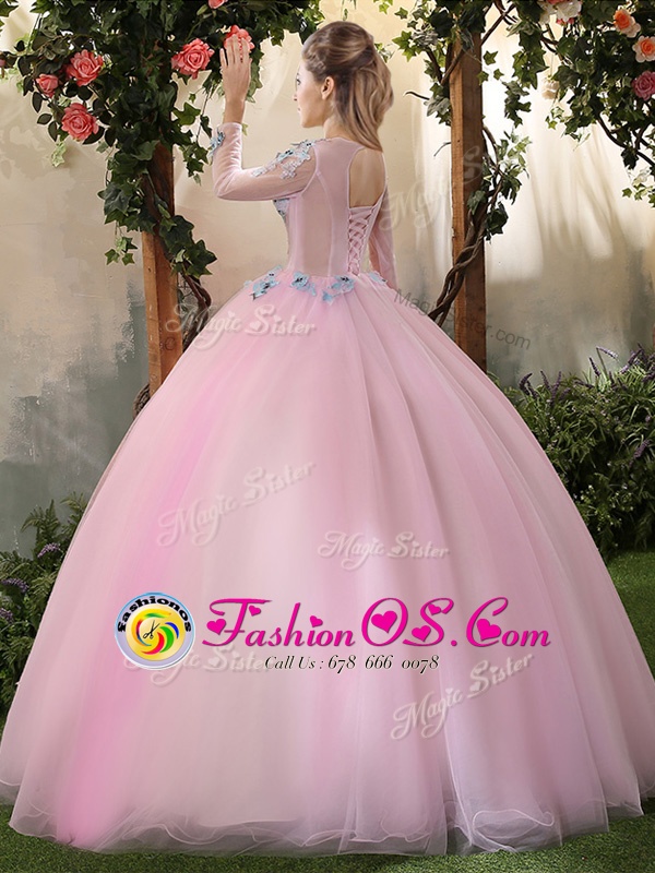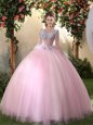 Enchanting Scoop Long Sleeves Tulle Floor Length Lace Up Vestidos de Quinceanera in Baby Pink for with Appliques