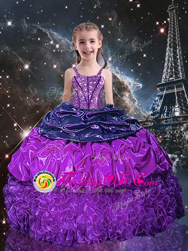 Home >  Special Occasion Dresses >  New Style Little Girl Pageant Dresses > Enchanting Spaghetti Straps Sleeveless Child Pageant Dress Floor Length Beading and Ruffles and Pick Ups Eggplant Purple Organza