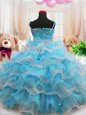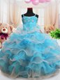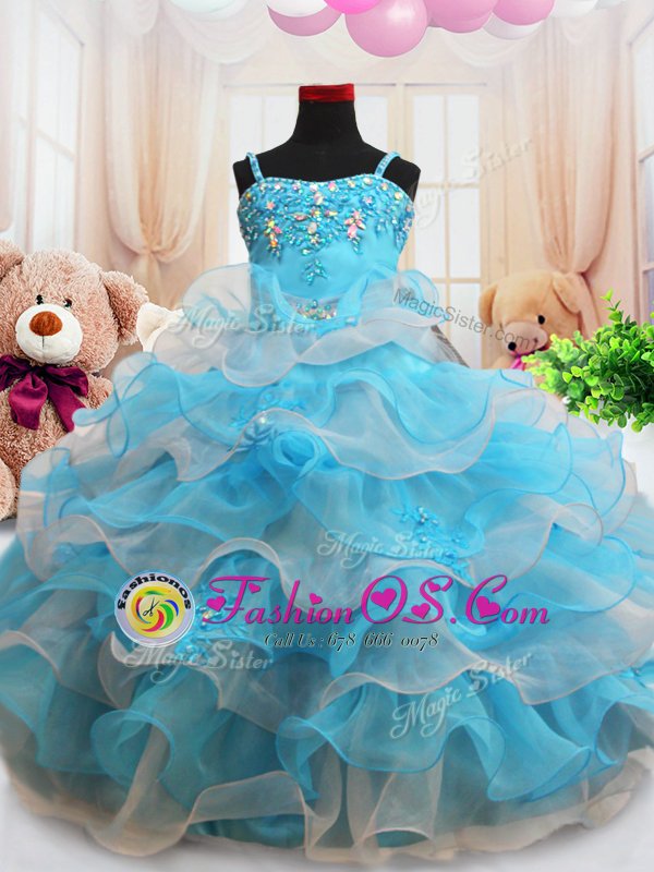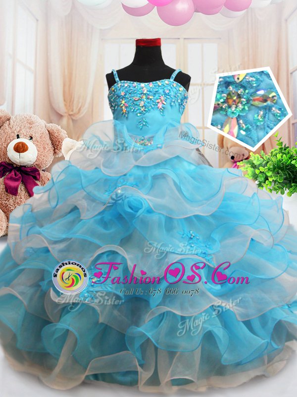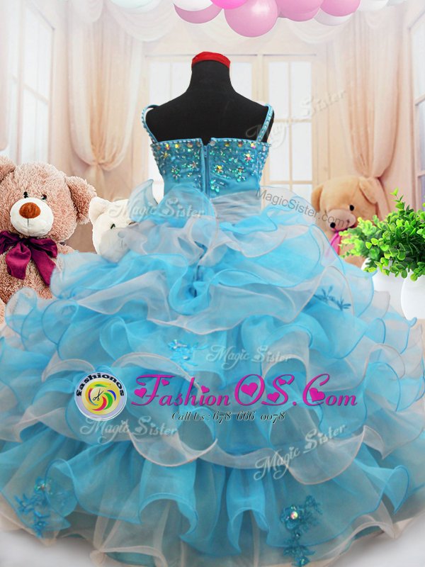 Enchanting Straps Baby Blue Sleeveless Floor Length Beading and Appliques and Ruffled Layers Zipper Toddler Flower Girl Dress