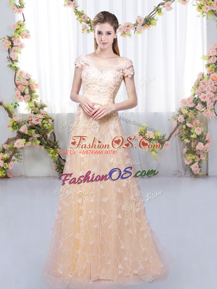 Excellent Cap Sleeves Floor Length Appliques Lace Up Bridesmaid Dress with Peach