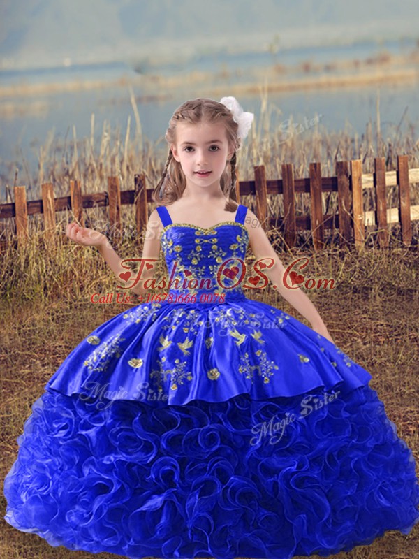 Excellent Embroidery Kids Formal Wear Royal Blue Lace Up Sleeveless Sweep Train