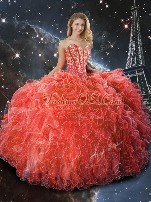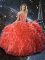 Excellent Floor Length Lace Up 15th Birthday Dress Coral Red for Military Ball and Sweet 16 and Quinceanera with Beading and Ruffles