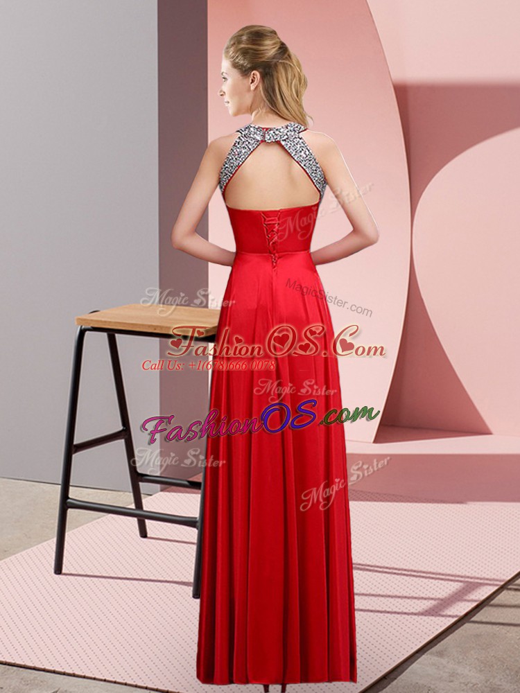 Home >  Prom Dresses >  Perfect Prom Dresses > Excellent Halter Top Sleeveless Prom Party Dress Floor Length Beading Purple Satin