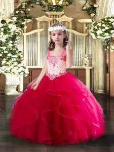Excellent Hot Pink Sleeveless Floor Length Beading and Ruffles Lace Up Pageant Gowns For Girls