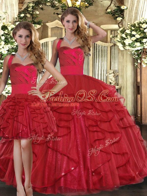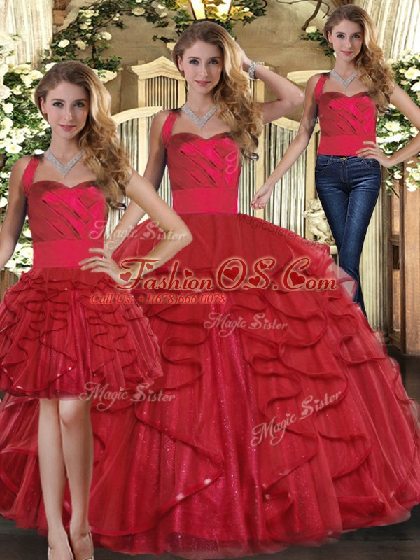 Excellent Red Three Pieces Tulle Straps Sleeveless Ruffles Floor Length Lace Up Ball Gown Prom Dress