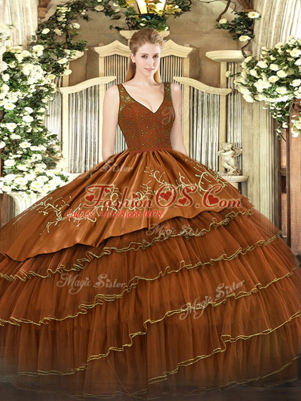 Excellent Rust Red Organza and Taffeta Backless V-neck Sleeveless Floor Length Vestidos de Quinceanera Beading and Lace and Embroidery and Ruffled Layers
