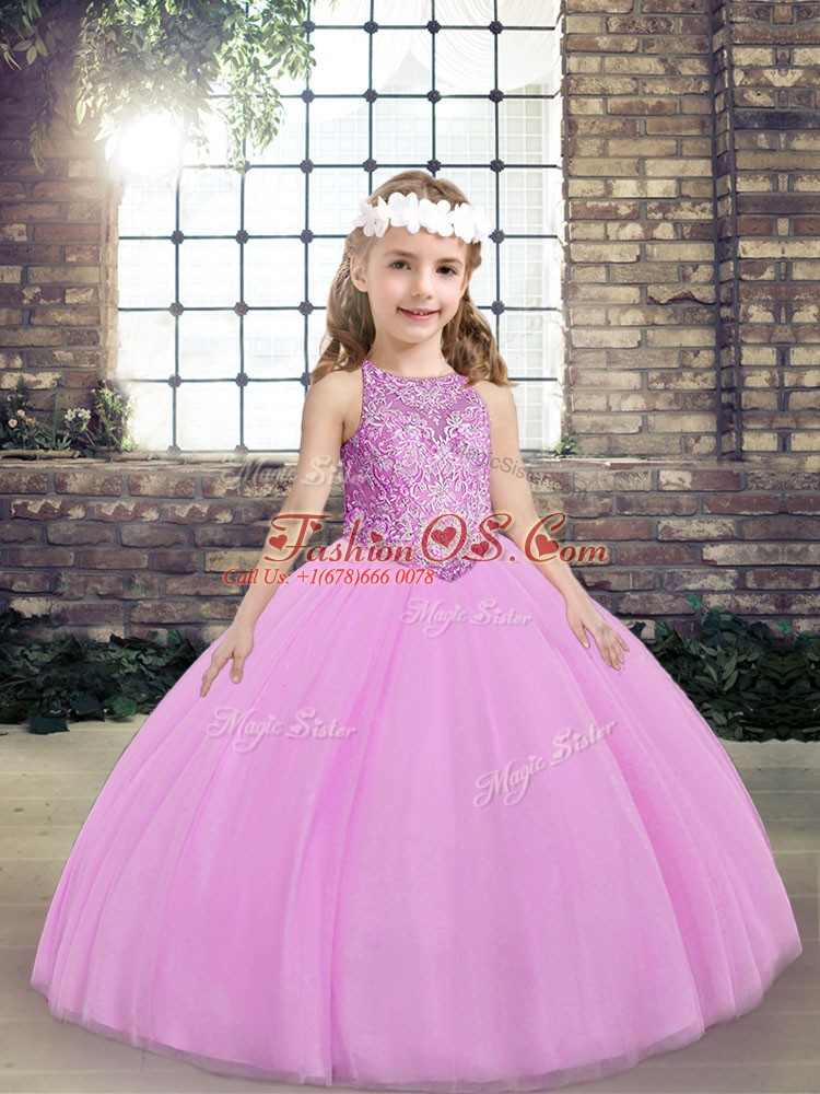 Excellent Sleeveless Floor Length Beading Lace Up Kids Pageant Dress with Lilac