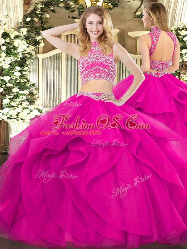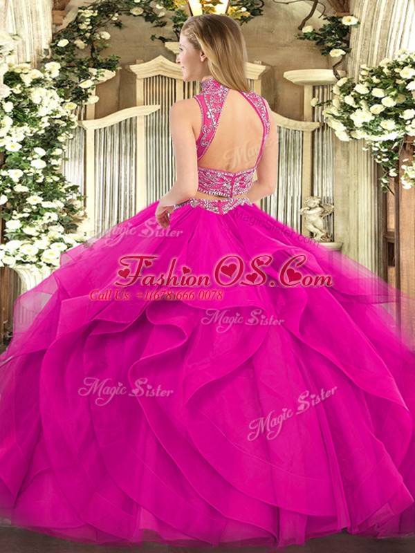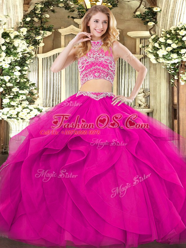 Home >  Quinceanera Dresses >  In Stock Quinceanera Dresses > Excellent Sleeveless Tulle Floor Length Backless Quinceanera Gown in Fuchsia with Beading and Ruffles