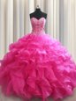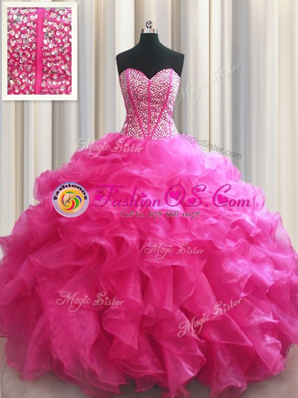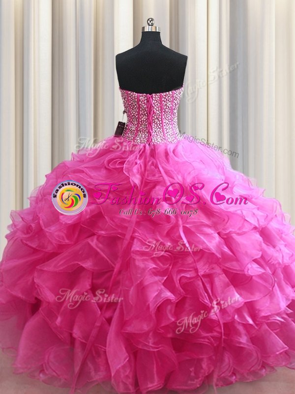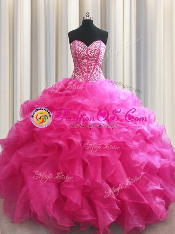 Home >  Quinceanera Dresses >  Fast Delivery Quinceanera Dresses > Excellent Visible Boning Hot Pink Organza Lace Up Sweet 16 Dress Sleeveless Floor Length Beading and Ruffles
