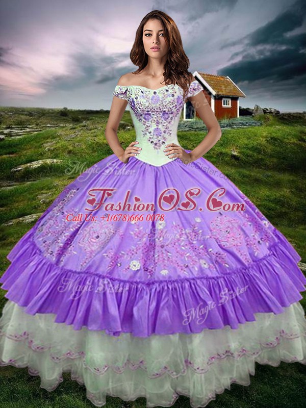 Silhouette: Ball Gowns Neckline: off the shoulder Sleeve Length: sleeveless Hemline/Train: floor length Back Detail: lace up Embellishment: beading,embroidery,ruffled layers Fabric: taffeta Shown Color: lavender(Color & Style representation may vary by monitor.) Occasion: military ball,sweet 16,quinceanera Season: spring,summer,fall,winter Fully Lined: Yes Built-In Bra: Yes