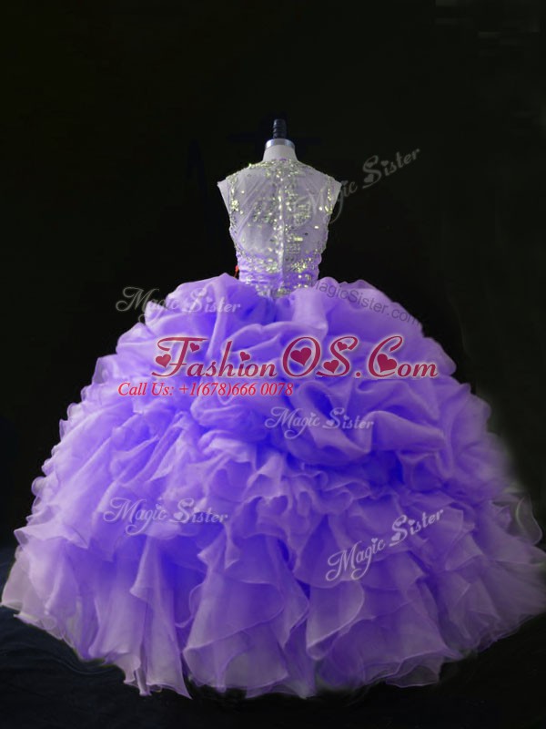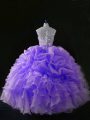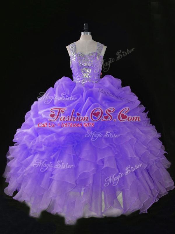 Exceptional Lavender Ball Gowns Straps Sleeveless Organza Floor Length Zipper Beading and Ruffles and Pick Ups Quinceanera Dress