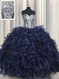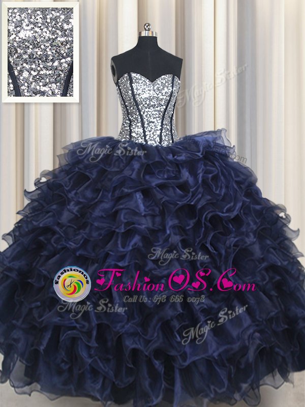Home >  Quinceanera Dresses >  In Stock Quinceanera Dresses > Exceptional Navy Blue Sleeveless Ruffled Layers and Sequins Floor Length 15 Quinceanera Dress