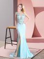 Exceptional Sleeveless Chiffon Sweep Train Backless Prom Dress in Aqua Blue with Beading