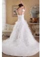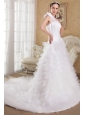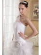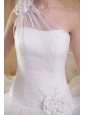 Exclusive A-line One Shoulder Chapel Train Satin and Organza Ruffles and Hand Made Flowers Wedding Dress