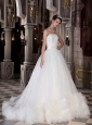 This A-line gown is everything that you've ever dreamed a wedding dress could be! The notable dress creates a touching effect which makes you the hotline. It features a symmetrical ruched bodice with a lovely sweetheart neckline. The smooth waistband accented with beading highlights the body curve. The focal point is the magnificent silhouette, great tulle fabric creates lots of fullness in the design. The multi-ruffled hem with soft feathers is absolutely a feast for eyes. The dress sways beautifully across the floor when you move, as if you're floating on air. A lace up corset style closure in the back secures the dress in place.