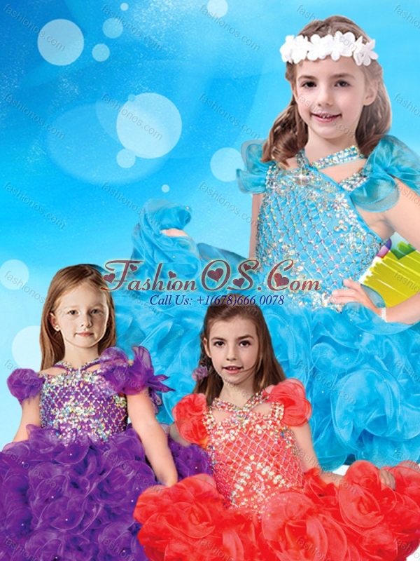 Exclusive Beaded and Ruffled Halter Top Little Girl Mini Quinceanera Dress with Criss Cross