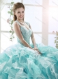 Home >  Quinceanera Dresses >  Unique Quinceanera Dresses > Exclusive Beaded and Ruffled Straps Quinceanera Dress in White and Aqua Blue