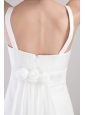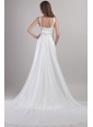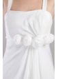 This gorgeous white straps chiffon wedding dress is highlighted with the watteau train which is flowing and intangible. The handle flowers in front and the back adds beauty and loveliness to the dress. This dress will make you becomea unique bride in your wedding!